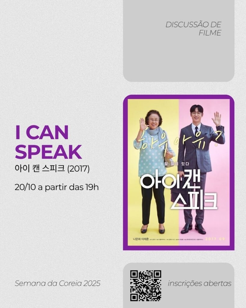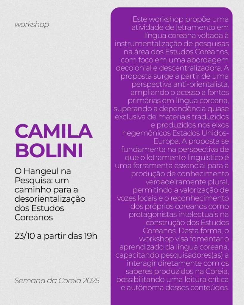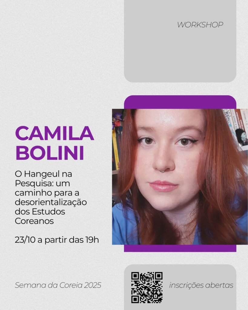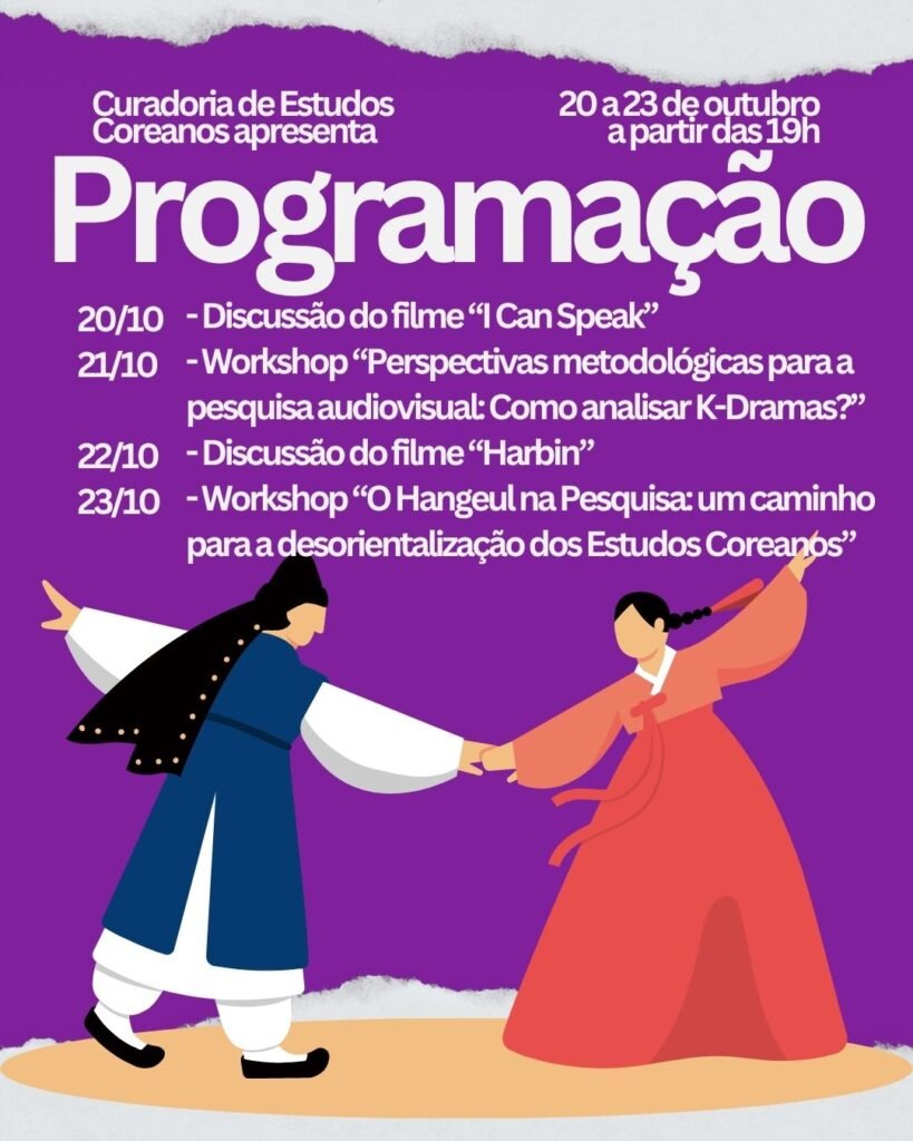 20/10 – Discussão do filme “I Can Speak” 21/10 – Workshop “Perspectivas metodológicas para a pesquisa audiovisual: Como analisar K-Dramas?” 22/10 – Discussão do filme “Harbin” 23/10 – Workshop “O Hangeul na Pesquisa: um caminho para a desorientalização dos Estudos Coreanos”