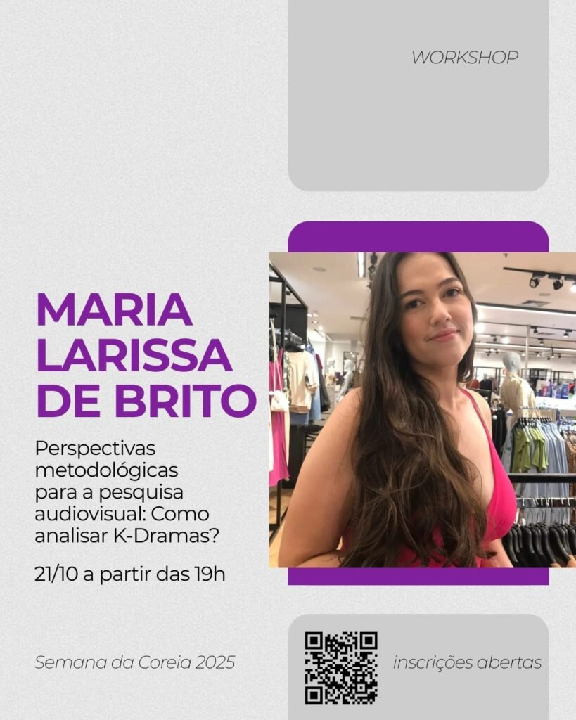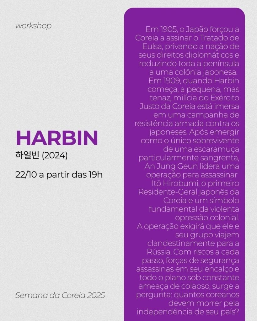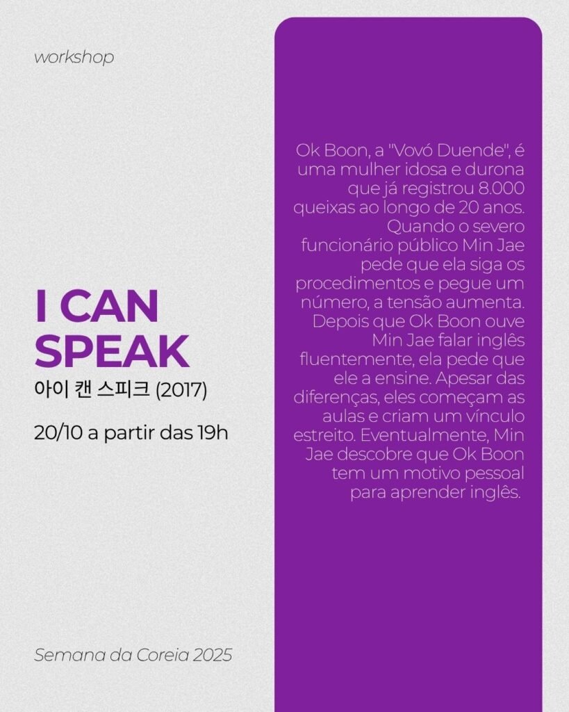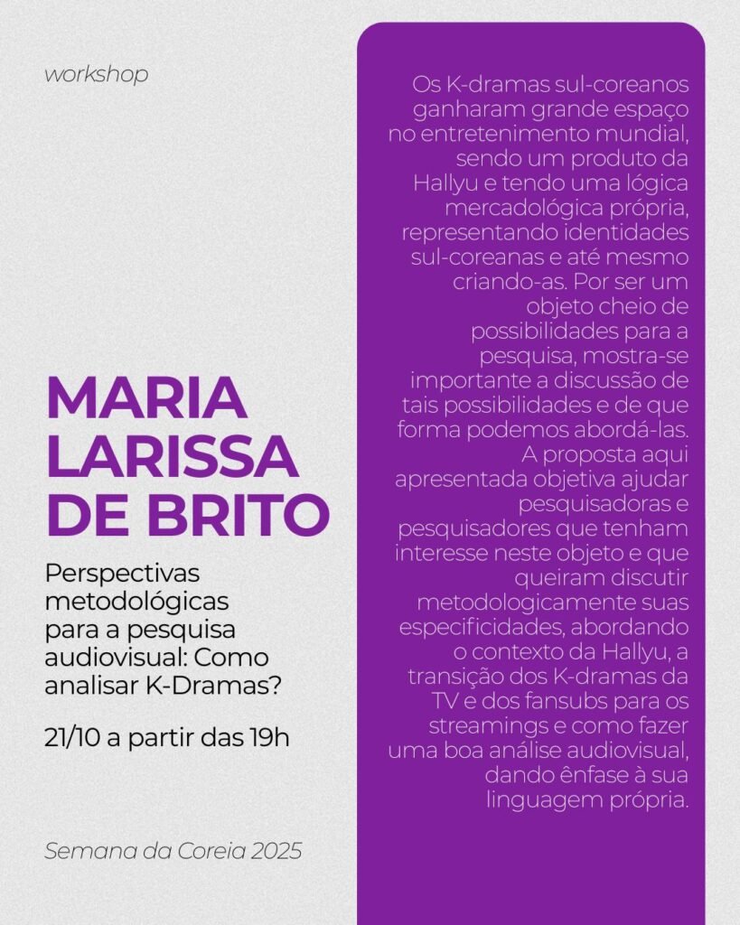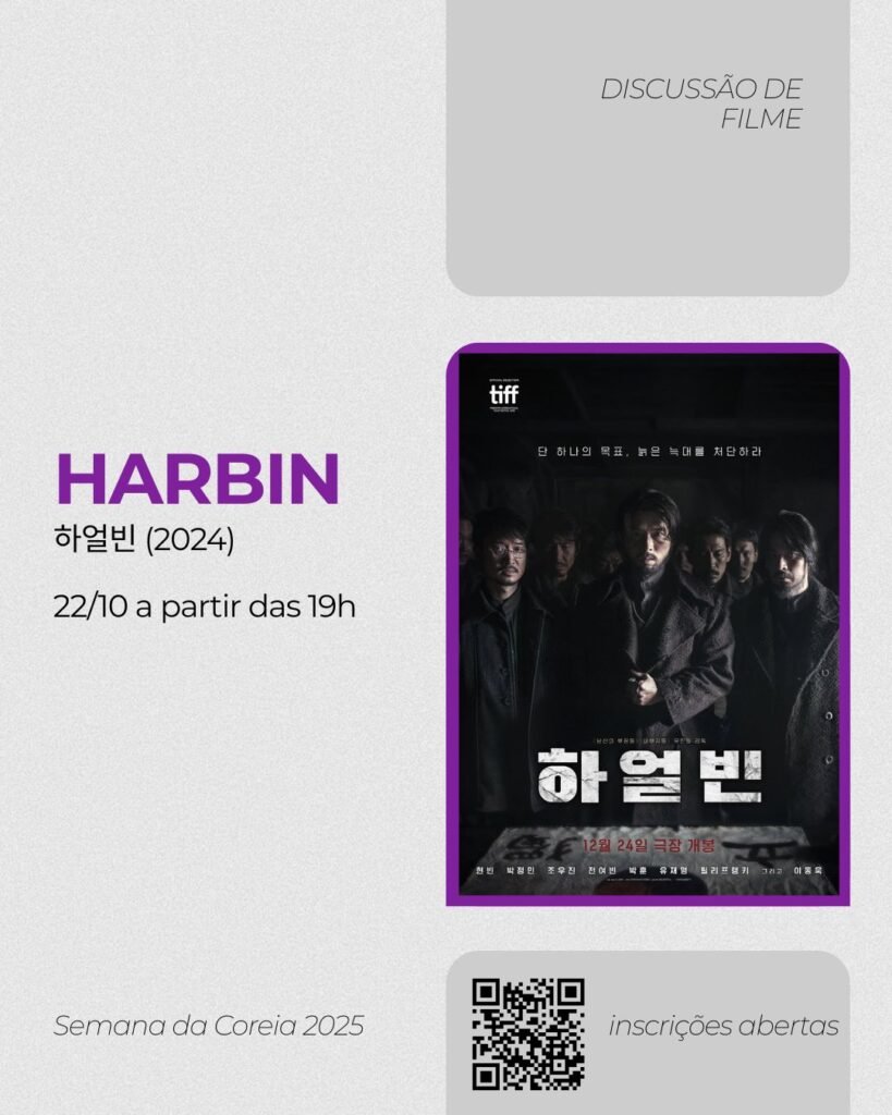 20/10 – Discussão do filme “I Can Speak” 21/10 – Workshop “Perspectivas metodológicas para a pesquisa audiovisual: Como analisar K-Dramas?” 22/10 – Discussão do filme “Harbin” 23/10 – Workshop “O Hangeul na Pesquisa: um caminho para a desorientalização dos Estudos Coreanos”